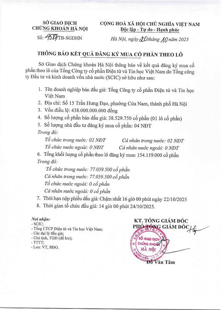 Thông báo Đấu giá cả lô cổ phần Tổng Công ty CP Điện tử và Tin học Việt Nam do SCIC sở hữu