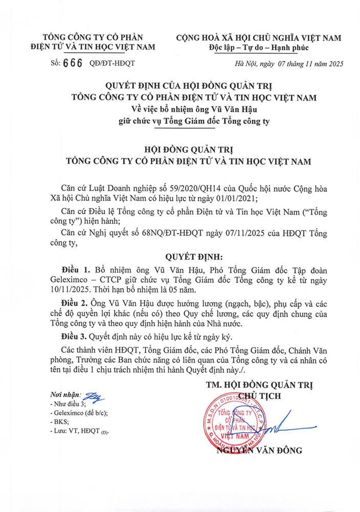 Bổ nhiệm Ông Vũ Văn Hậu giữ chức vụ Tổng Giám đốc Viettronics kể từ ngày 10/11/2025