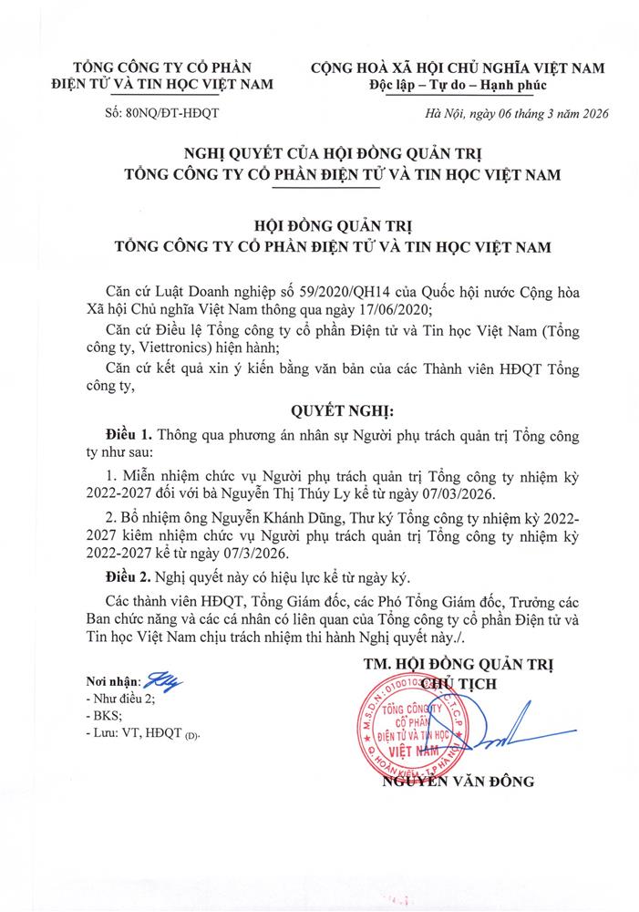 • Quy chế hoạt động của Hội đồng quản trị Tổng công ty Viettronics (12/01/2026)