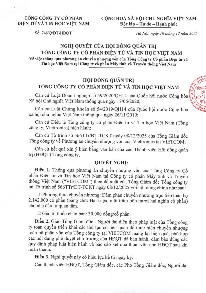 • Nghị quyết HĐQT vê việc chuyển nhượng vốn của Viettronics tại Công ty cổ phần máy tính và truyền thông Việt Nam